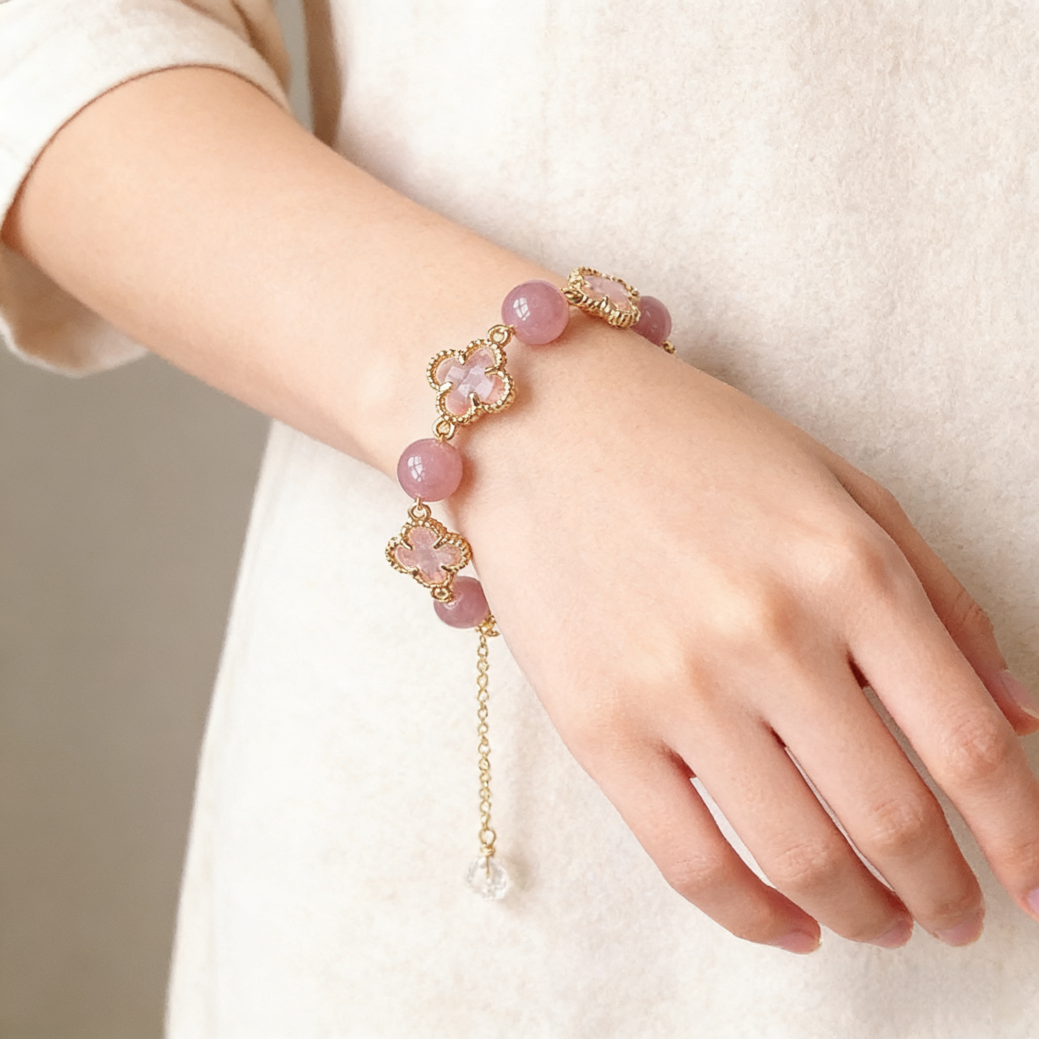This bracelet is that “Fated Clover,” lit by love’s ripple, united with gentle Rose Quartz. It carries not just a gift, but an active wish and tender declaration. The Rose Quartz’s soft glow represents your desire to attract all things sweet and beautiful to her, surrounding her with love. The clover is your promise that loving her is your life’s greatest fortune, and you are the harbor guarding that luck. It’s a gift that crowns “love” itself.
